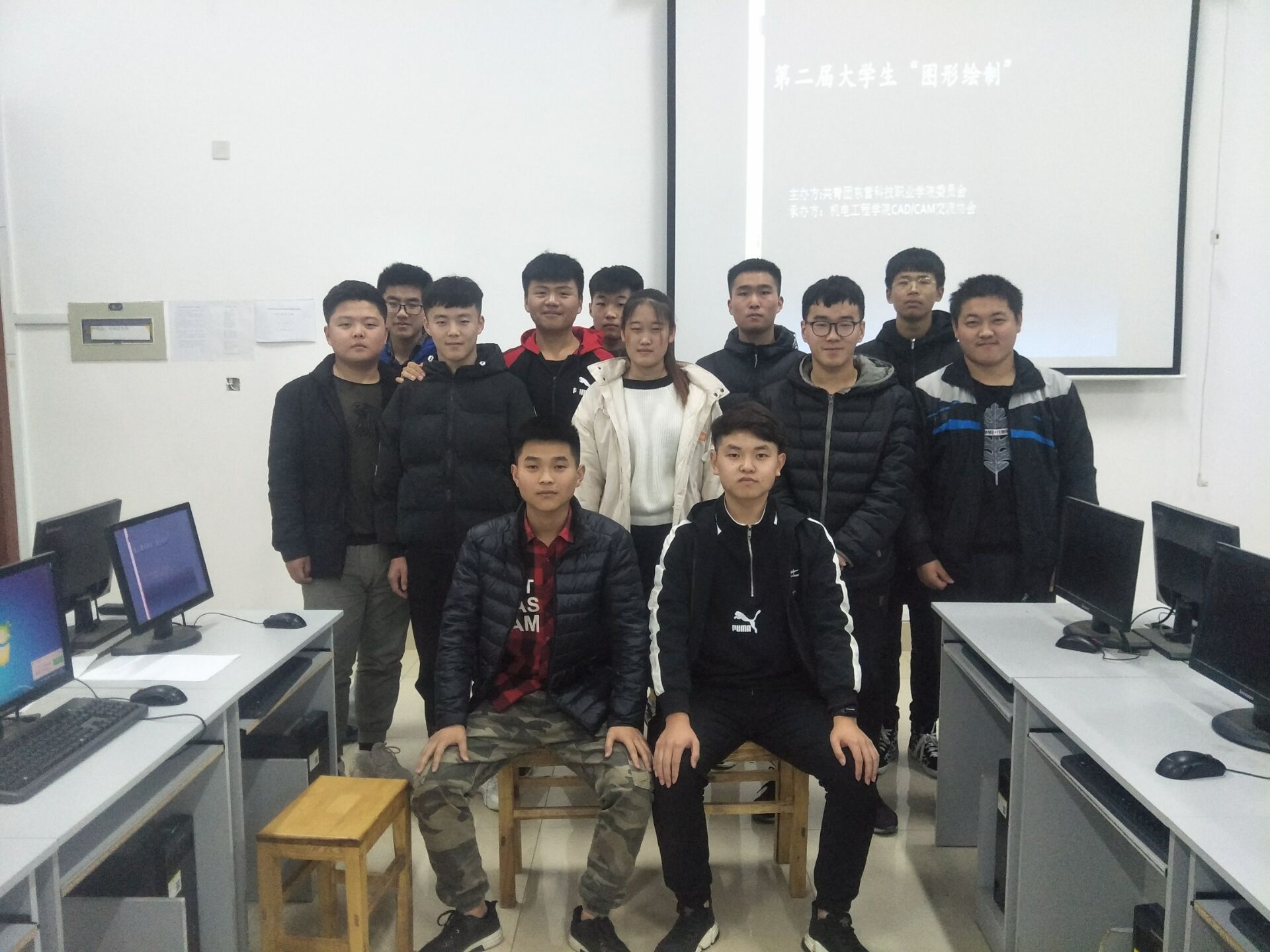 比赛在会长的组织下有序的进行,选手轮流上台十分钟内画图评委进行打分,十分钟内绘制图形进行1:1抄画。第一组是18机电五班周生康、18机械班岳东,18石油化工二班任继发同学第一组上场比赛。比赛由张强计时比赛,第二组比赛的同学18机电四班武一泽同学,18机械班王文硕同学,18机电五班张雪壮同学。第三组比赛人员龙彦周同学,18石油化工1班徐晓梅同学,18机电四班马传举同学,18机电二班刘嵩同学。时间很快就过去了,每人十分钟,时间过的很快让我们记住这些美丽的瞬间,有这些时刻我们的日子便不再平庸,感谢参赛的同学,比赛结束比赛结果会在CAD社团群里发布,最后参赛同学与组织者合影留念。