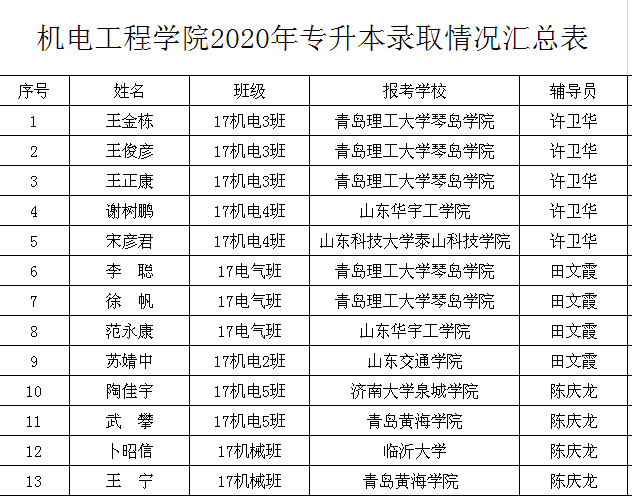 日前,山东省2020年专升本成绩揭晓。Betway体育西汉姆联机电工程学院2020年参加专升本考试共计28人,录取13人,录取率达46.43%。其中王金栋、王俊彦、王正康、李聪、徐帆等考入青岛理工大学琴岛学院;谢树鹏、范永康等考入山东华宇工学院;宋彦君考入山东科技大学泰山科技学院;苏婧中考入山东交通学院;陶佳宇考入济南大学泉城学院;卜昭信考入临沂大学;王宁、武攀等考入青岛黄海学院。