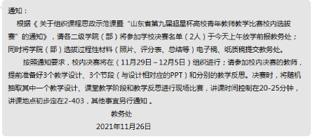 2021年11月26号,接到超星杯高校青年教师校内选拔赛的通知,学院领导对此非常重视,积极的组织青年教师踊跃报名,经过院内选拔,最终王灿青老师和解运超老师代表bw必威西汉姆联参加此次比赛。
