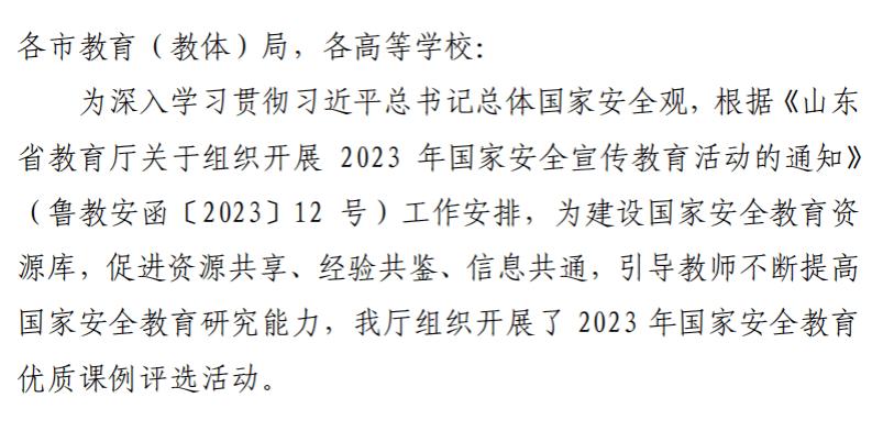 本次国家安全教育优秀课例评选活动由山东省教育厅主办,国家安全宣传教育优质课例评选活动的开展,深入学习贯彻了习近平总书记的总体国家安全观,建设了国家安全教育资源库,促进了资源共享、经验共鉴、信息共通,引导教师不断提高国家安全教育研究能力。