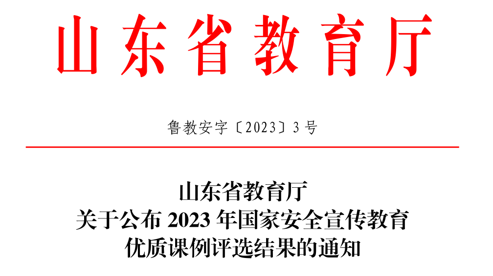 近日,山东省教育厅发布《关于公布2023年国家安全宣传教育优质课例评选结果的通知》,我校王宗玲、安丰金老师的作品《国家安全、人人有责》荣获高校组一等奖。